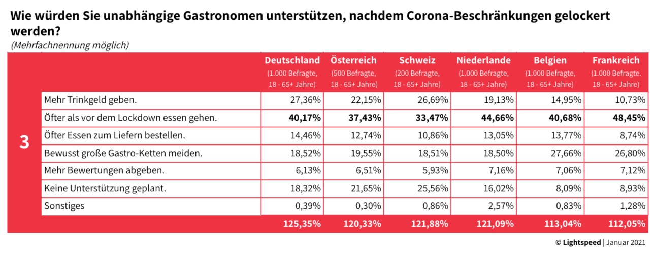 Laut der Umfrage ist jeder vierte Bundesbürger (27%) dazu bereit, mehr Trinkgeld zu geben, um unabhängige Gastronomen zu unterstützen. Nur in der Schweiz ist die Bereitschaft dafür ähnlich groß. Noch deutlich mehr, nämlich über 40%, würden bewusst auch öfter essen gehen als vor dem Lockdown, noch einmal jeder Siebte würde mehr Essen zum Liefern bestellen.
