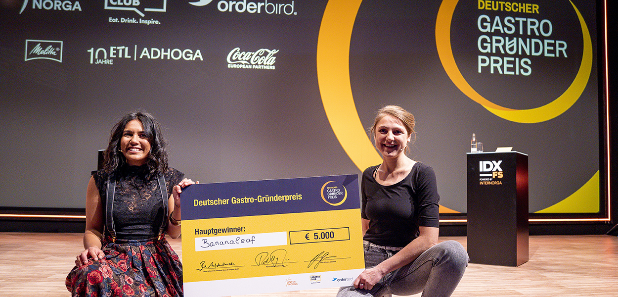 Die Entscheidung für „Bananaleaf" fiel knapp aus, da auch die anderen vier nominierten Gastro-Konzepte durch Wirtschaftlichkeit und Innovationsgeist überzeugten. Ob „Die Fette Beete", eine saisonale Gemüseküche aus Krefeld, „Dr & Dr Middle Eastern Culture and Food Lab" mit einem Mix aus persischer, arabischer und israelischer Küche, die Borkumer Korn Bar „Geeske & der swarte Roelf" und das nachhaltige Hamburger Restaurant „Klinker" – gewonnen haben am Ende alle.