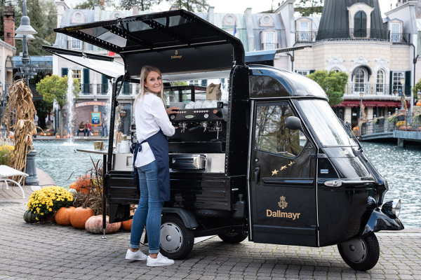 Auch bei Events im Europa-Park sorgt Dallmayr mit mobilen Lösungen für die perfekte Kaffeepause zwischendurch. Eine im Dallmayr-Design gestaltete Piaggio Ape verwöhnt die Besucher unterwegs mit hochwertigen Kaffeespezialitäten aus der Siebträgermaschine und im Sommer können sich die Gäste auf frisch zubereitete Eistees aus einem umgebauten Eisteefahrrad freuen.
