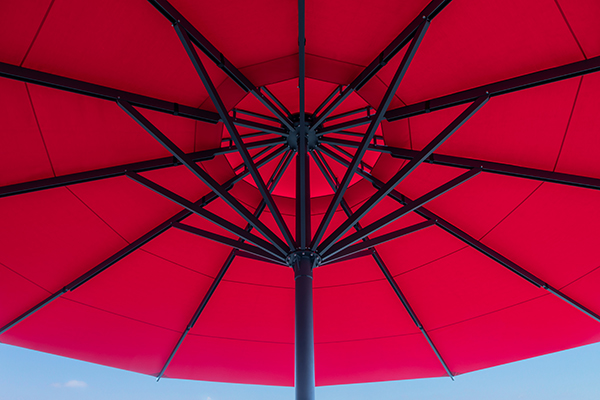Dank einer Auswahl von mehr als 120 Acryl-Stofftüchern und 200 RAL-Gestellfarben lässt sich der Großschirm auch farblich bestens aufs Ambiente abstimmen.
