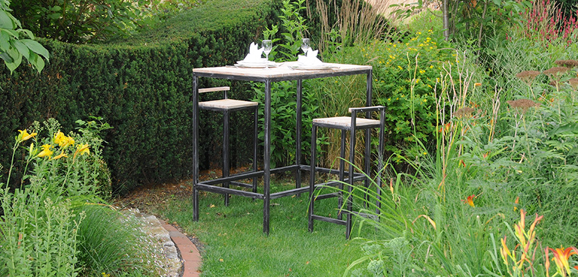Gefertigt werden anschließend Möbel für innen und außen, wie z. B. die Outdoor-Serie MALAGA. Galvanisierter Stahl mit einer Outdoor-Pulverbeschichtung trifft auf recyceltes Teakholz und vereint sich zu einem trendigen Materialmix, der zudem wenig Pflege benötigt und auch bei Wind und Wetter im Freien bleiben kann. Erhältlich sind neben den Bartischen und -hockern auch Esstische mit den passenden Sitzbänken.