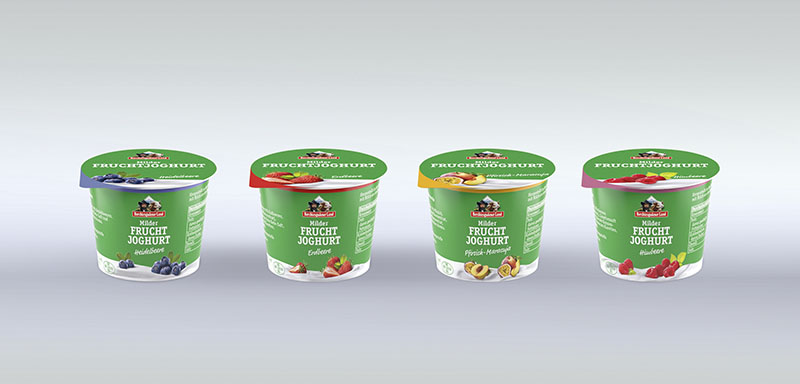 Bei der Verpackung berücksichtigt die Molkerei Berchtesgadener Land umwelt- und ressourcenschonende Kriterien. Statt Becher aus 100% Kunststoff zu verwenden, hat man sich für den nachhaltigen Zweikomponenten-Becher entschieden und spart somit knapp 20% an Plastik. Für den optimalen Produktschutz wird der Fruchtjoghurt in dünne, mit Aludeckel versiegelte Kunststoffbecher aus Polypropylen abgefüllt. Die für Lagerung und Transport nötige Stabilität erhält der Becher durch die Pappmanschette, die aus FSC-zertifiziertem Karton aus nachhaltiger Forstwirtschaft besteht.
