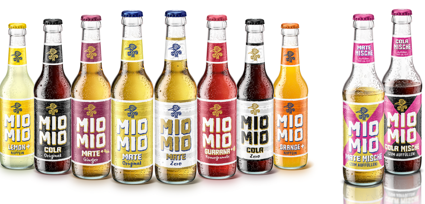Neben den bekannten Mio-Mio-Geschmäckern Mate Original, Mate Zero, Mate Ginger, Cola Original, Cola Zero und Guarana Pomegranate sind auch die beiden kürzlich eingeführten Sorten Orange + Koffein und Lemon + Koffein Teil des Longneck-Portfolios. Die Produkte sind auch im neuen Gewand für alle Sorten vegan, klimaneutral gestellt und mit 100% Ökostrom produziert – genau wie beim etablierten 0,5-l-Mehrweg-Gebinde.