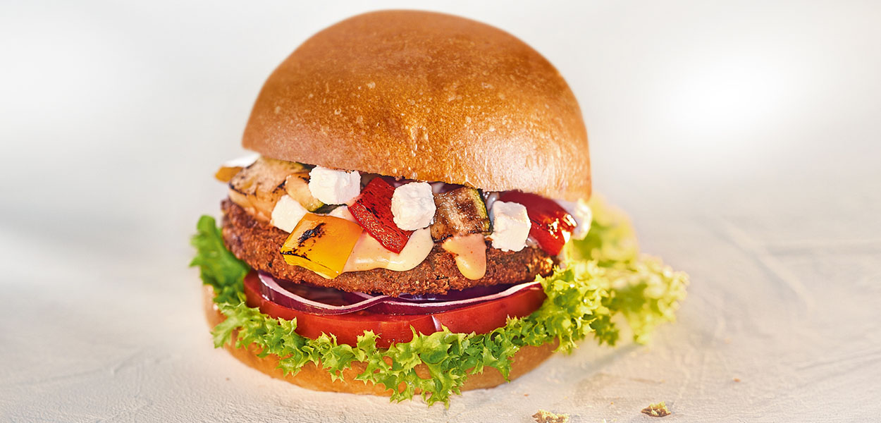 Den klimaneutralen, vegetarischen Burger WEGWEISER mit Falafelbratling, Ziegenkäse, Grillgemüse und Knoblauchsoße gibt es seit Ende April in allen HANS IM GLÜCK Burgergrills.