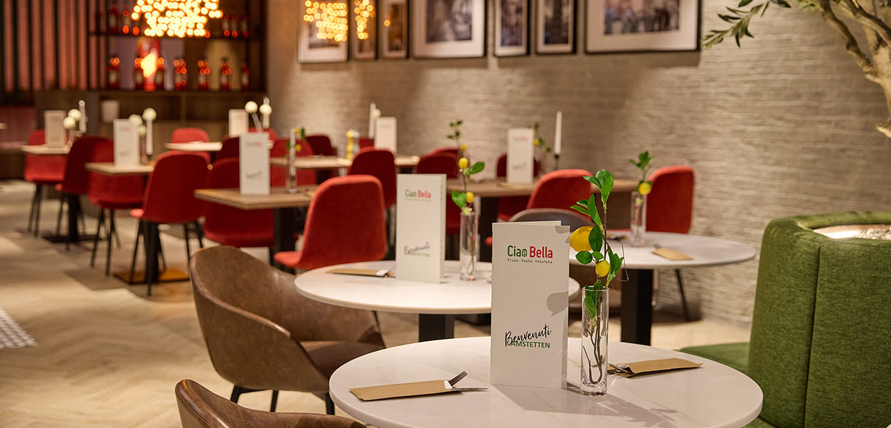 Der neue Standort umfasst insgesamt 293 qm, davon 254 qm Gastfläche, und bietet über 160 Gästen Platz. Ab Frühjahr 2026 ergänzt eine Außenterrasse mit knapp 50 weiteren Sitzplätzen das Angebot. Das Innendesign des Restaurants orientiert sich am Anspruch, italienische Lebensfreude in ein modernes, zugleich warmes Ambiente zu übersetzen. Klare Gestaltungselemente, natürliche Materialien, eine harmonische Lichtführung und präzise aufeinander abgestimmte Farben prägen die Atmosphäre. Eine charakteristische Vespa-Installation an der Wand, halbrunde Sofabereiche und der für Ciao Bella typische Olivenbaum setzen visuelle Akzente, die den Raum unmittelbar einladend wirken lassen.