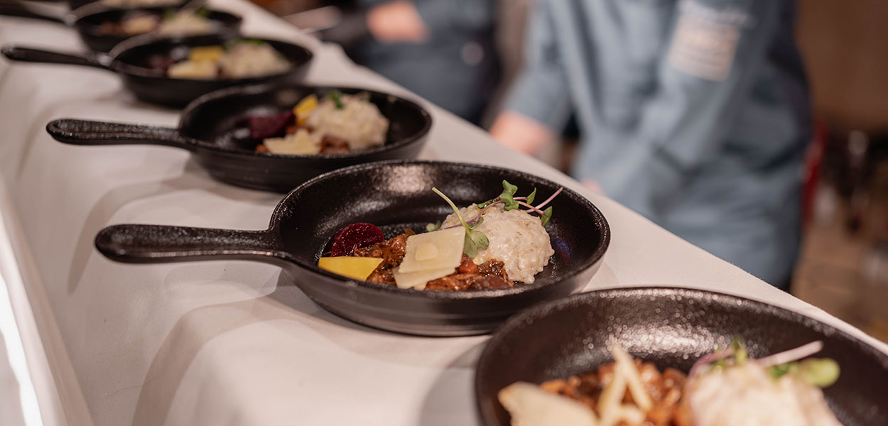 Die Verantwortung für den klassischen Hauptgang übernahm das Team vom Panoramahotel Oberjoch. Kalbsragout mit Perlgraupenrisotto und geschmorter Beete. Dieser Gang verband Tradition mit modernem Handwerk und wurde im Rahmen des Walking Dinners von den ca. 600 anwesenden Gästen hoch gelobt.