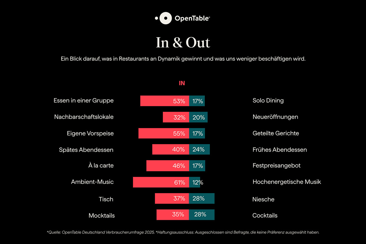Diesen Trend bestätigen auch die OpenTable-Daten aus 2025: Gruppenreservierungen (sechs oder mehr Personen) nahmen im Jahresvergleich um 7 % zu.** Für die Mehrheit (76 %) ist Essen gehen außerdem eine Möglichkeit, sich mit anderen verbunden zu fühlen.* Diese Verbundenheit zeigt sich auch beim Date-Night-Dining, das laut OpenTable-Daten bei Besuchsanlässen im Jahr 2025 um deutliche 112 % zunahm.**
